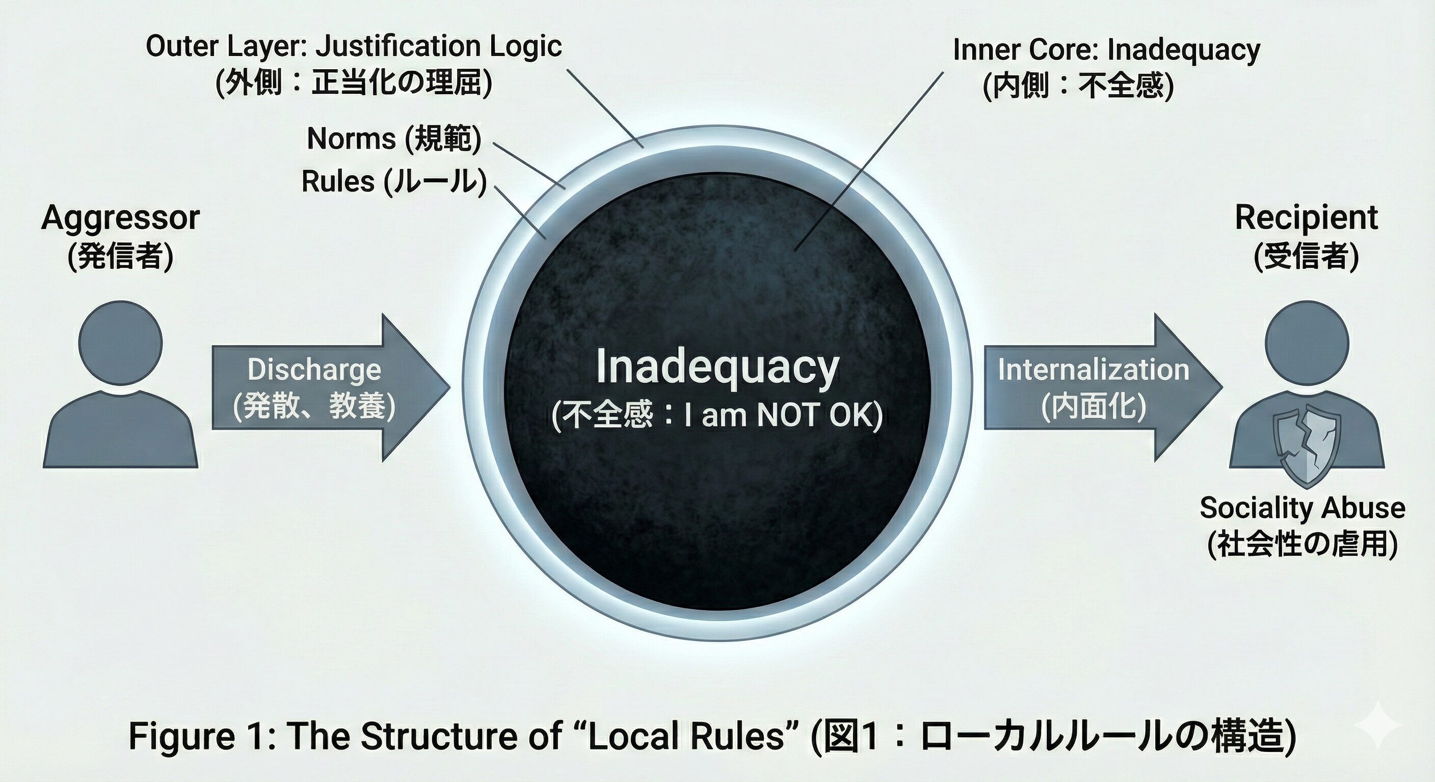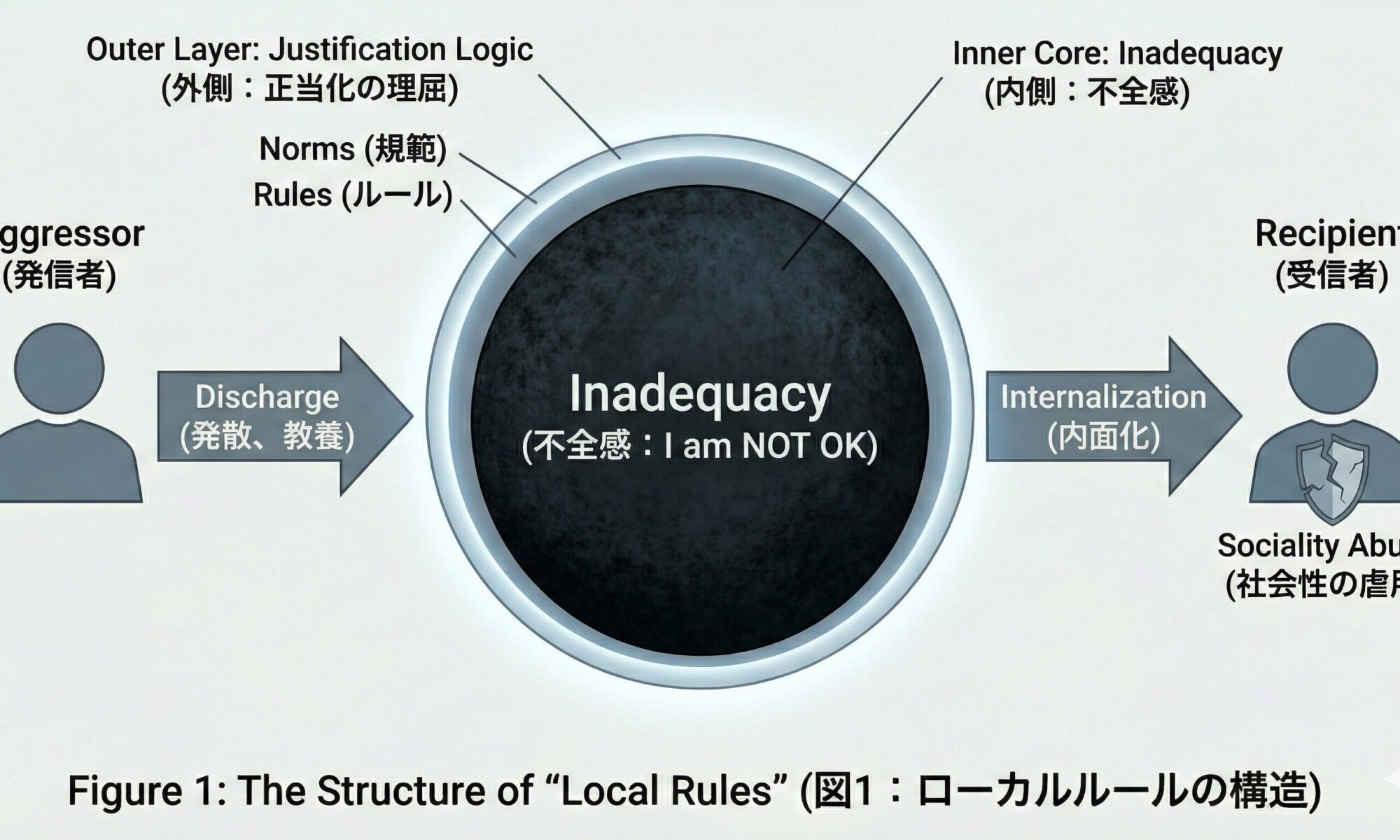 ローカルルール(偽ルール)とは、一時的な不全感の発散のみならず、飲み込んだ相手を自らの下位に置き、支配する関係性を作り出すことでもあるのです。